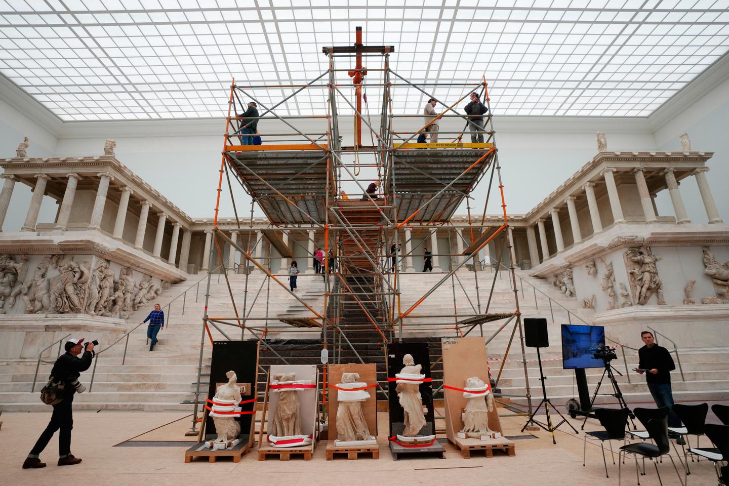 Pour déjouer cette malédiction, les autorités ont dévoilé, jeudi 4 décembre, les deux premières ailes du musée, qui doivent rouvrir au printemps 2027, dont celle qui présente le grand autel de Pergame. Pièce maîtresse des collections, cette reconstitution grandeur nature d’un monument religieux de l’époque hellénistique, dont les restes furent découverts en Asie Mineure à la fin du XIXe siècle par une équipe d’archéologues allemands, alors que le Reich était allié à l’Empire ottoman, attirait 1 million de visiteurs par an avant la fermeture. C’est elle qui donna son nom au Musée de Pergame, qui fut construit autour, aucun autre musée de l’île ne pouvant l’accueillir, vu ses dimensions.