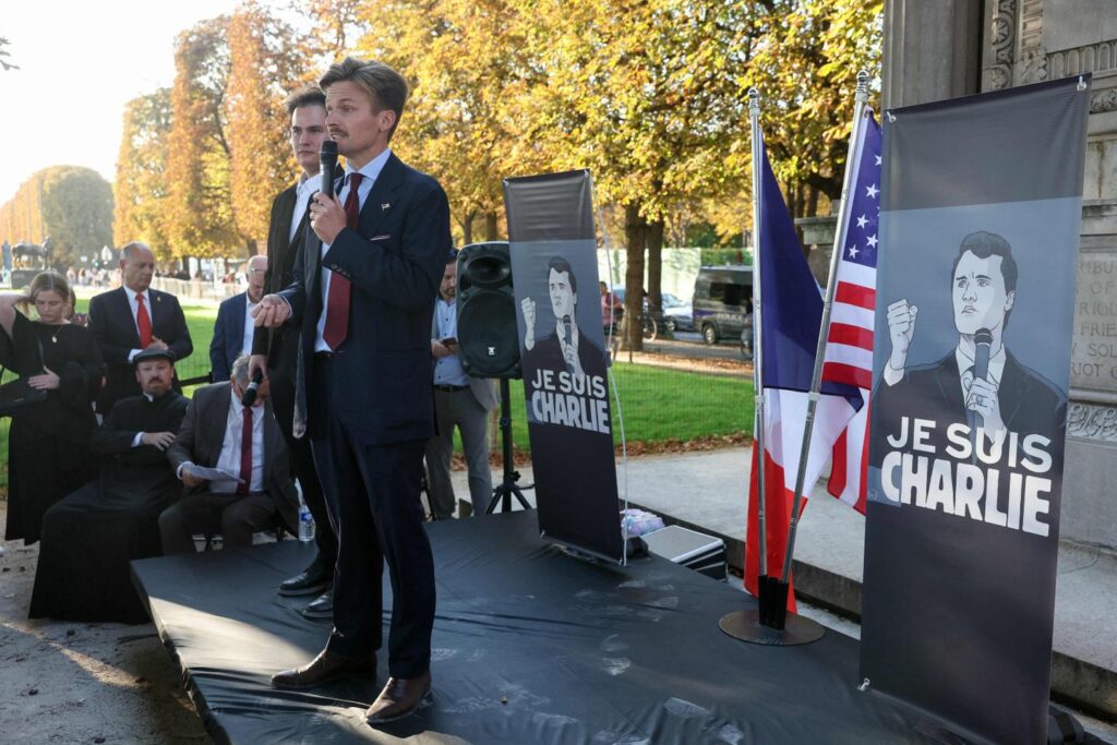 Sur une petite scène, deux bannières représentent Charlie Kirk dessiné, avec le slogan « Je suis Charlie », apparu lors des attentats islamistes contre la rédaction de Charlie Hebdo, le 7 janvier 2015. Peu importe que le journal défende des valeurs à l’opposé de celles exprimées vendredi soir (notamment la laïcité, la liberté des femmes à disposer de leur corps). Peu importe que rien ne relie l’idéologie des frères Kouachi, responsables de l’attaque de l’hebdomadaire français à celle, pas encore définie, de Tyler Robinson. L’organisateur de l’événement, Nicolas Conquer, affirme qu’il y a un lien entre les deux Charlie : « Les mêmes balles les ont tués. »