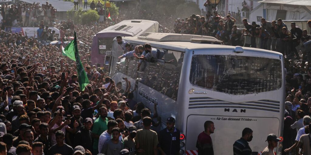 Plusieurs bus transportant les prisonniers libérés ont été accueillis par une foule en liesse à Ramallah, en Cisjordanie occupée, et à Khan Younès, dans le sud de la bande de Gaza.