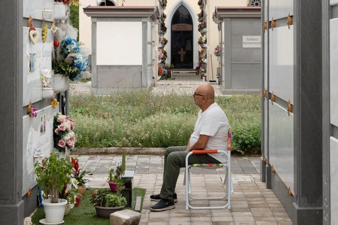 D’un pas mécanique, cet homme taciturne vêtu d’un tee-shirt blanc rejoint le secteur dit « nuovissimo » (« le plus récent ») du cimetière d’Acerra, une ville de 60 000 habitants, posée là où les lointains faubourgs du nord de Naples rencontrent la campagne, au pied du Vésuve.
