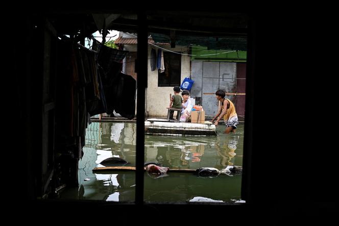 Des enfants utilisent un radeau de fortune pour traverser une rue inondée à la suite des pluies, intensifiées par la violente tempête tropicale Bualoi, à Dela Paz, Binan, dans la province de Laguna, aux Philippines, le 26 septembre 2025.