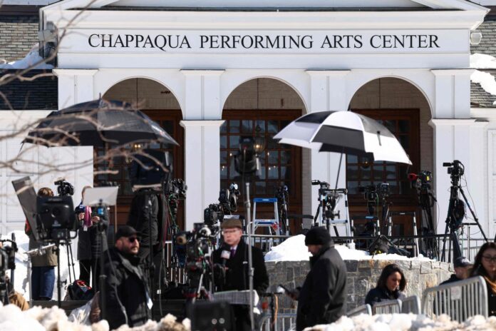 Devant le centre des performances artistiques de Chappaqua (Etat de New York), où Bill Clinton a témoigné devant la commission de la Chambre des représentants qui enquête sur les liens de personnalités avec Jeffrey Epstein, le 27 février 2026.