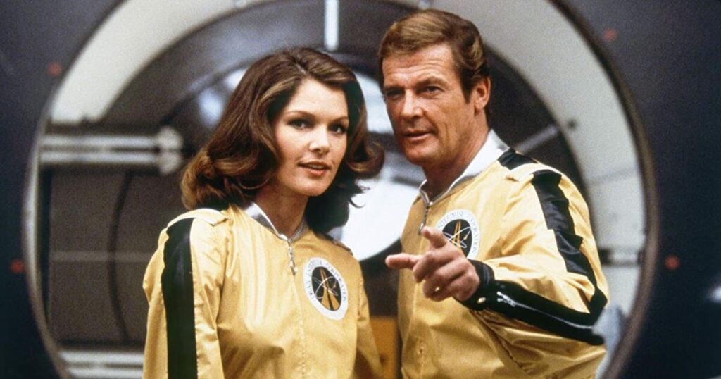 For the original Moonraker poster, Moore was stood in a silver space suit surrounded by female characters.