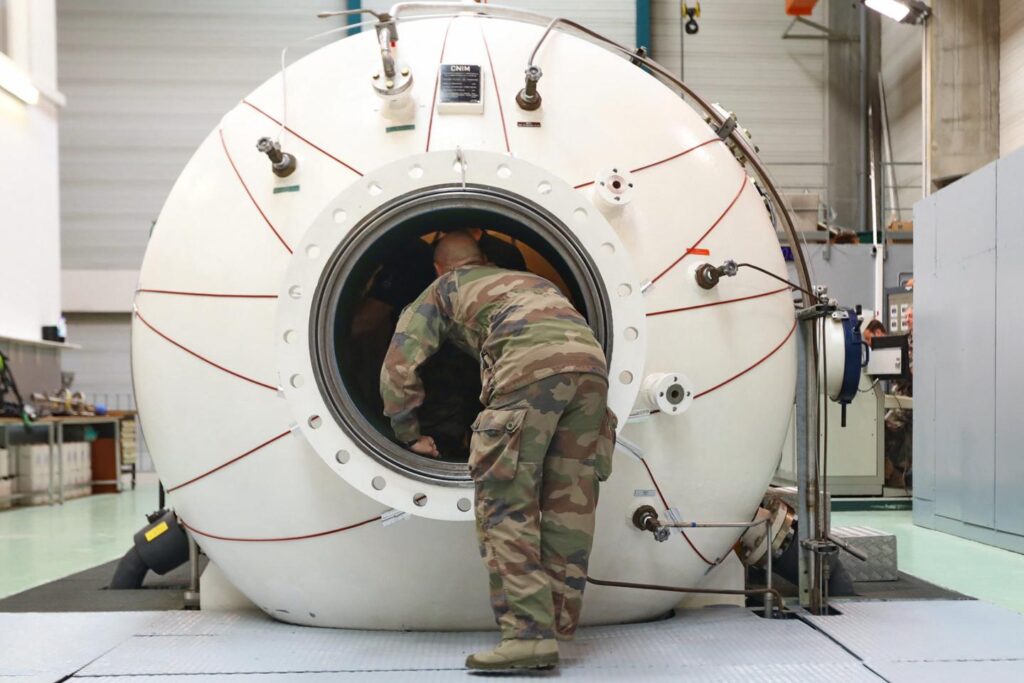 « Vanne 876 fermée ! », « Paré en pression ! », « 1, 2, 3… Top, mise en pression ! » Il est exactement 14 h 45, ce vendredi 30 janvier sur la base navale de Toulon. La marine nationale se prépare à battre un nouveau record du monde. En l’occurrence, explique le capitaine de frégate Arnaud Le Beguec, commandant du Cephismer (Centre expert plongée humaine et intervention sous la mer), celui de la « plongée à saturation la plus profonde jamais réalisée à l’aide d’un recycleur électronique ». Revêtus d’une tenue de plongée, le capitaine de corvette Romain et le premier-maître Adrien, qui patientaient, au niveau d’une tourelle, descendent dans un caisson « humide », empli d’une eau à 15 °C. Puis commence l’exercice : parvenir à actionner la clé du système de ventilation et de dépressurisation d’une maquette de sas de sous-marin et y fixer des manchons en respirant, dans des bouteilles, un mélange d’hélium et d’oxygène, et en travaillant sous une pression de 27,5 bars, équivalant à celle qu’ils connaîtraient à… 265 mètres sous la surface de l’océan !