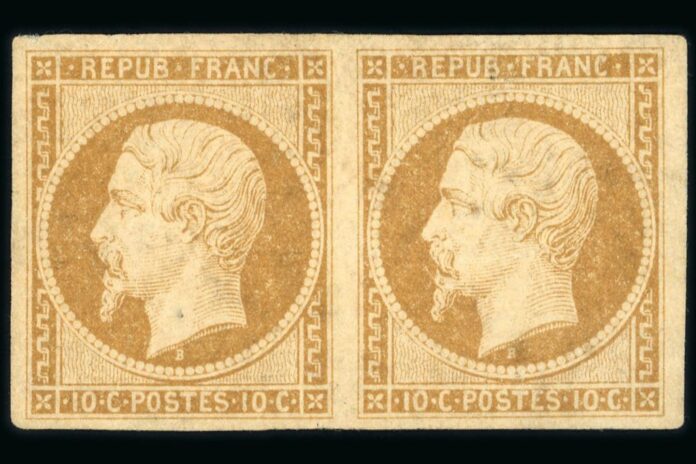 Une paire neuve du 10 centimes bistre « Présidence », « avec pleine gomme d’origine » et « seule paire neuve connue à ce jour » vaut bien l’estimation de 50 000 à 80 000 euros, tandis qu’une paire oblitérée du 10 centimes bistre Napoléon non dentelé, « Empire Franc. », impression au recto et au verso – encore une pièce unique –, est à 30 000/60 000 euros.