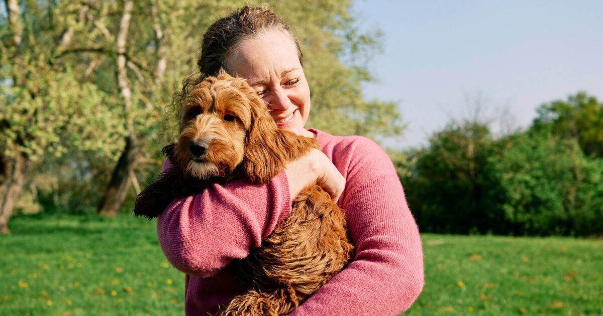 UK, Essex, woman holding her Cockapoo dog in a green field on an early spring morning (Image: Gary Yeowell via Getty Images)