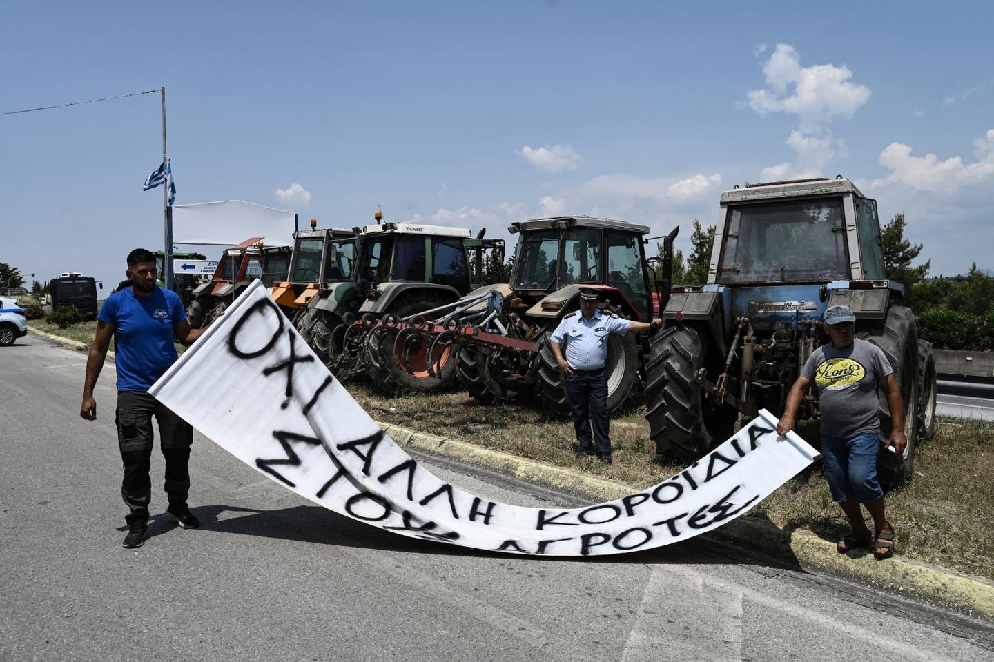 Une bannière « Plus de moqueries pour les agriculteurs », lors d’une manifestation, près du village de Mesimeri (Grèce), le 6 juin 2025. Les agriculteurs protestent contre les fraudes aux subventions agricoles européennes qui les pénalisent.