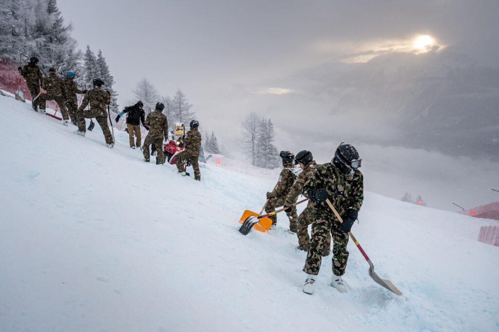 Des soldats de l’armée suisse préparent une piste de ski avant la dernière séance d’entraînement pour une épreuve de descente de la Coupe du monde de ski alpin féminin, à Crans-Montana (Suisse), le 29 janvier 2026.