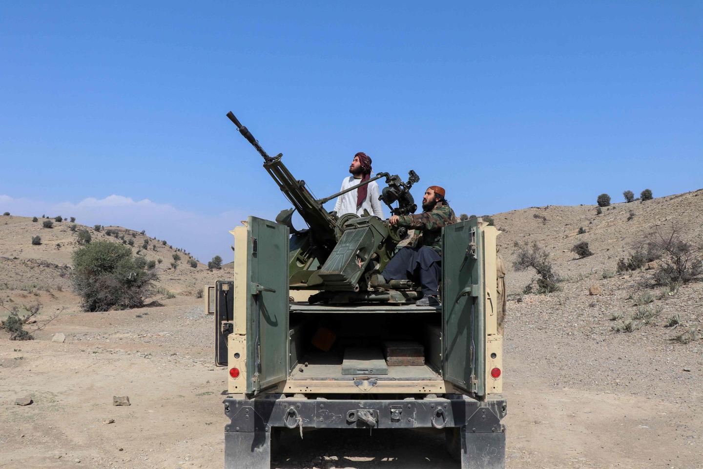 Des talibans surveillent le ciel proche de la frontière entre l’Afghanistan et le Pakistan, dans la province de Khost (Afghanistan), le 27 février 2026.