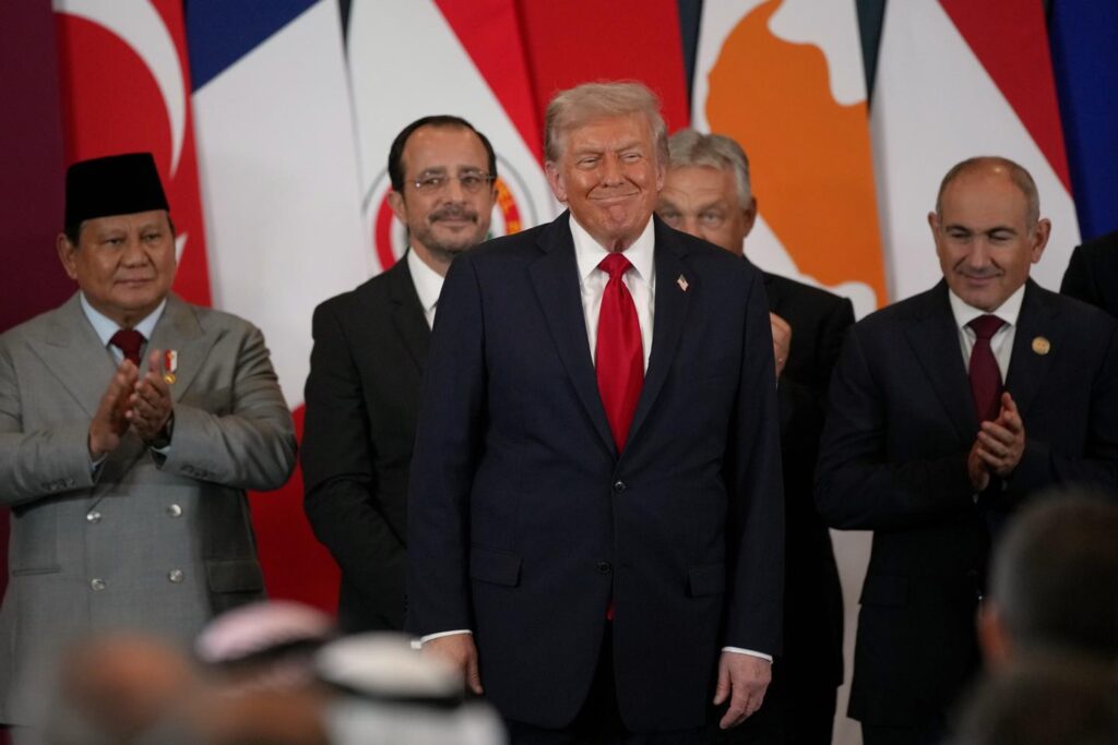 Le président Donald Trump lors d’un sommet des dirigeants mondiaux sur la fin de la guerre à Gaza, à Charm El-Cheikh (Egypte), le 13 octobre 2025.