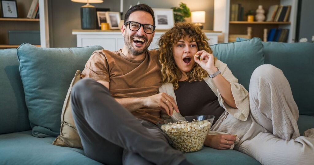 Couple caucasian man and woman sit at home on sofa bed watch tv movie