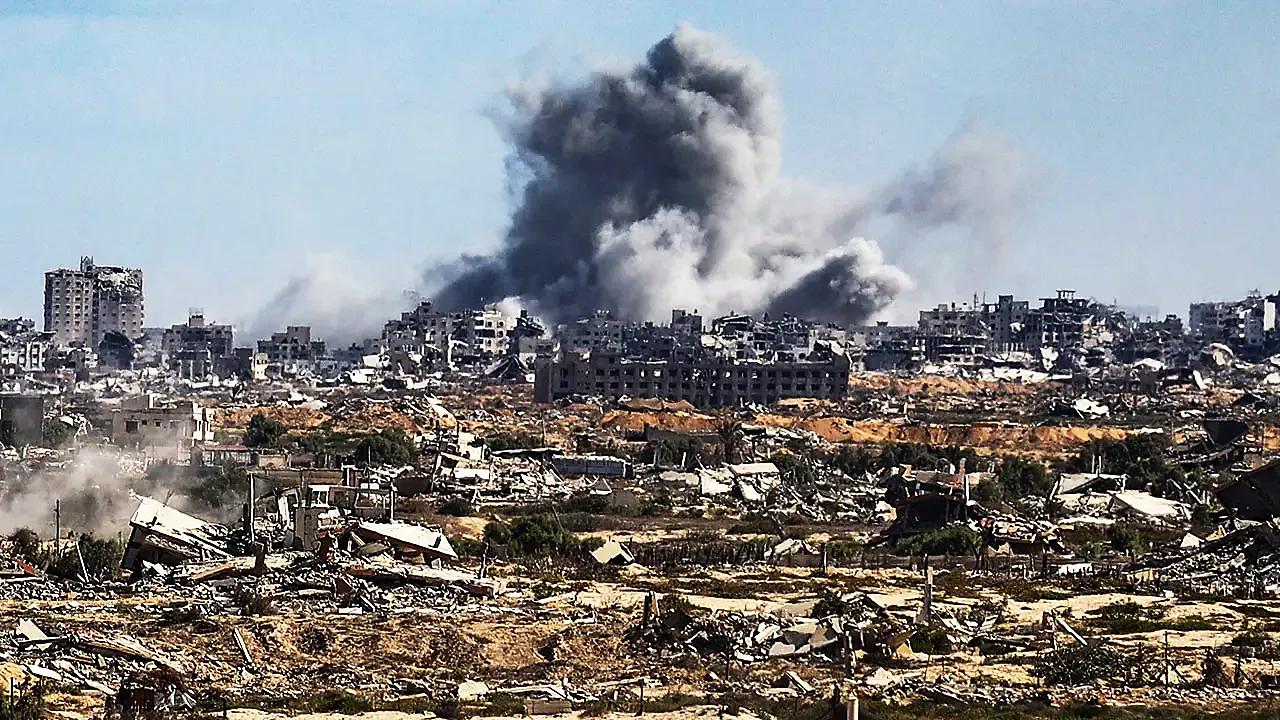 Smoke rises from Deir al Balah, following intense Israeli military attacks on Gaza City, on Oct. 5, 2025. (Khames Alrefi/Anadolu via Getty Images))