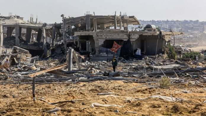 Person walks among damage and debris in Khan Younis in the Gaza Strip