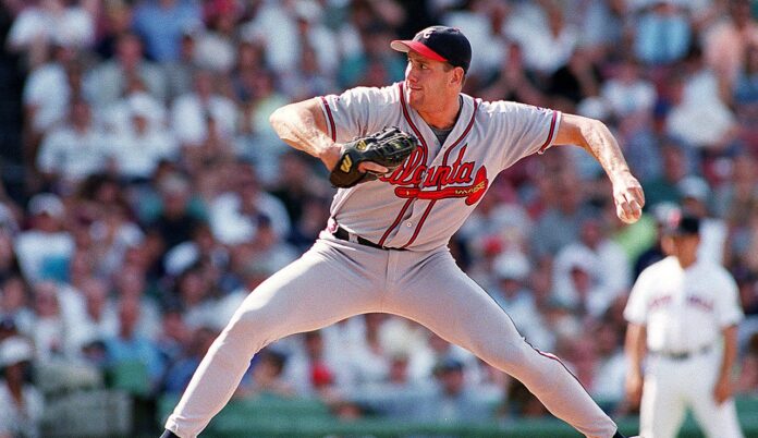 Atlanta Braves closer John Rocker throws in the 10th inning of an MLB game. (MediaNews Group/Boston Herald via Getty Images)