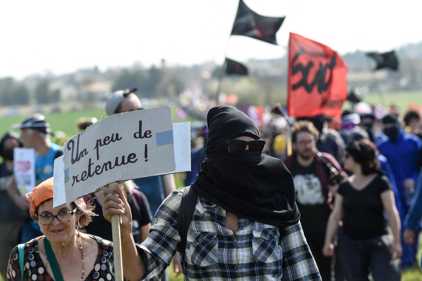 Des manifestants, lors d’un rassemblement pour protester contre un projet de construction de bassins de stockage d’eau agricole à grande échelle dans la zone marécageuse du Marais poitevin, à La Rochenard, dans les Deux-Sèvres, le 26 mars 2022.