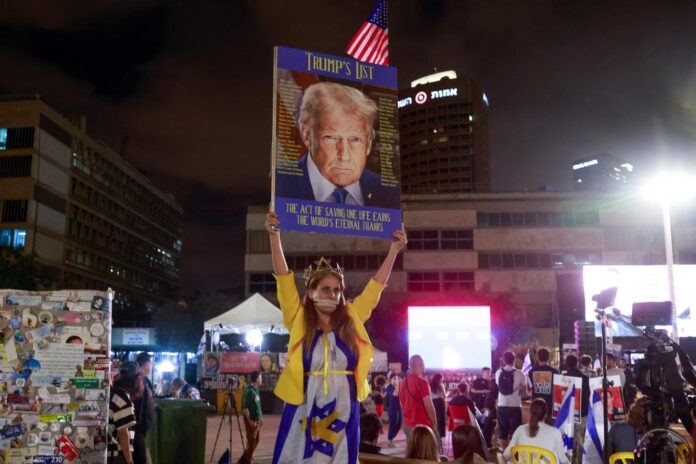 Une femme brandit une affiche de Donald Trump sur la « place des Otages », à Tel-Aviv, tôt le 13 octobre 2025.