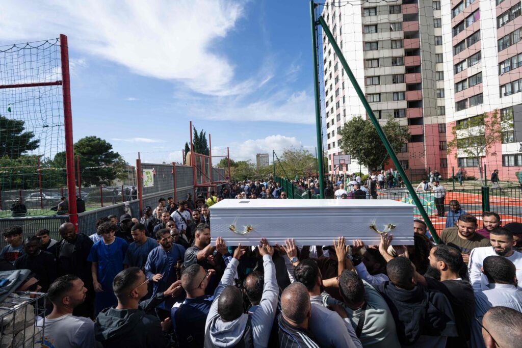 Des personnes tiennent le cercueil de Nessim Ramdane lors d’une cérémonie à la mosquée de la Méditerranée à Marseille, dans le sud de la France, le 8 octobre 2024