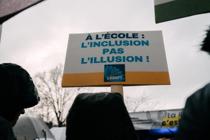 Une pancarte lors d’une manifestation de soutien aux personnes handicapées, le jour du 20ᵉ anniversaire de la loi handicap à Paris, le 10 février 2025.