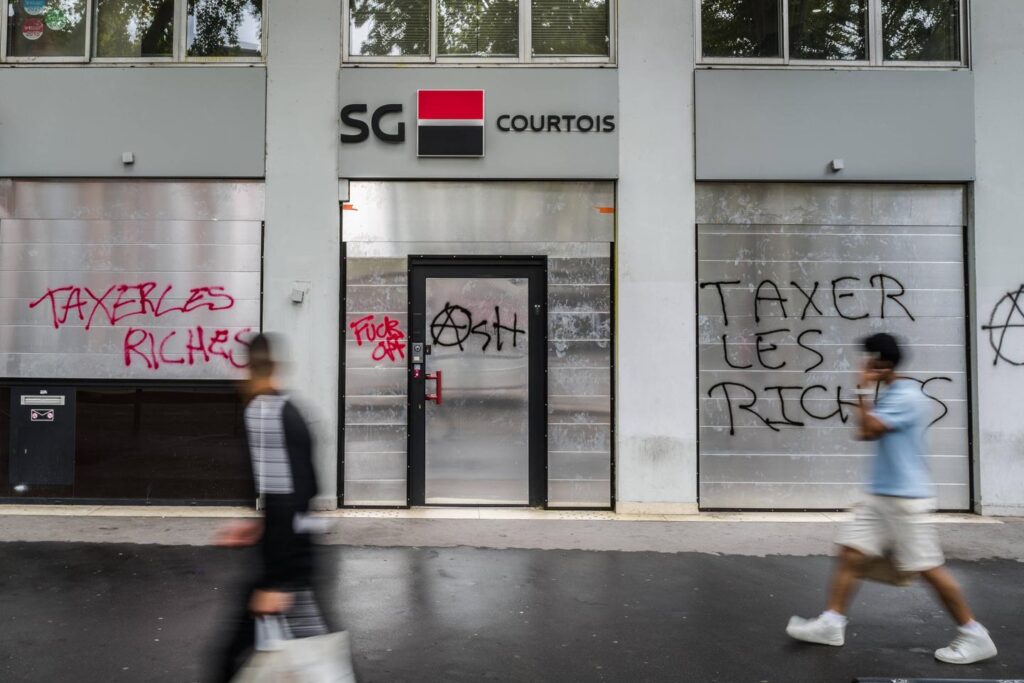 Devant une banque cible de graffitis, en marge de la manifestation du mouvement Bloquons tout, à Toulouse, le 10 septembre 2025.