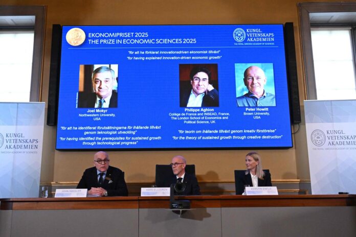 Le prix Nobel d’économie a été décerné lundi 13 octobre à l’Américano-Israélien Joel Mokyr, au Français Philippe Aghion et au Canadien Peter Howitt pour leurs travaux sur l’impact des nouvelles technologies sur la croissance économique.