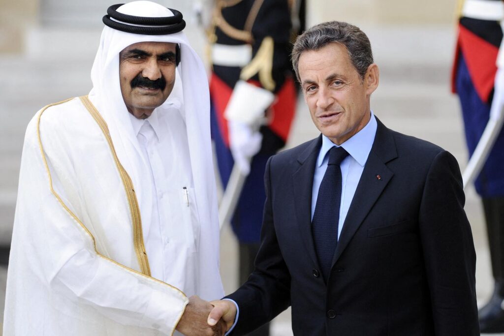 L’ancien président Nicolas Sarkozy (à droite) accueille l’ancien émir du Qatar, cheikh Hamad Ben Khalifa Al Thani, au palais de l’Elysée, à Paris, le 1ᵉʳ septembre 2011.