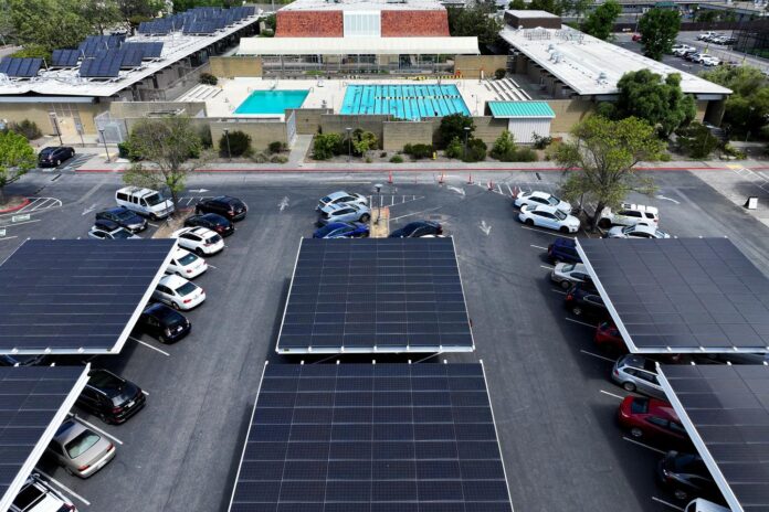 Panneaux solaires sur le parking d’un collège à Kentfield (Californie), aux Etats-Unis, le 25 avril 2024.