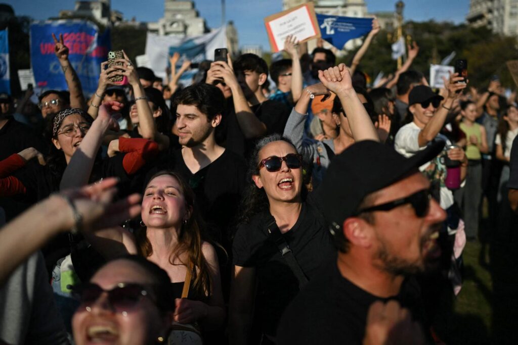Des milliers de personnes rassemblées devant le Congrès national pour protester contre les veto du président argentin, Javier Milei, à Buenos Aires, le 17 septembre 2025.