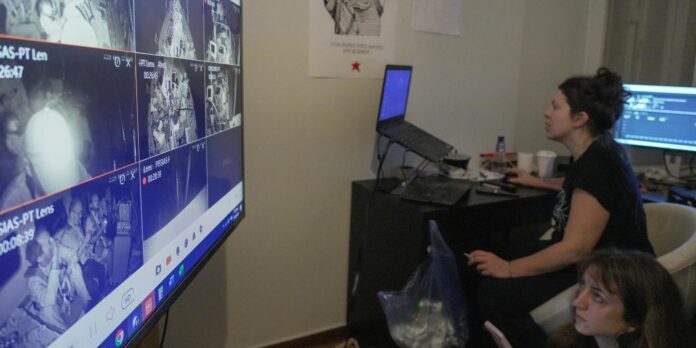 Des militants grecs du mouvement Global Sumud Flotilla surveillent la flottille pour Gaza depuis une salle de contrôle, à Athènes, en Grèce, le 1er octobre 2025.
