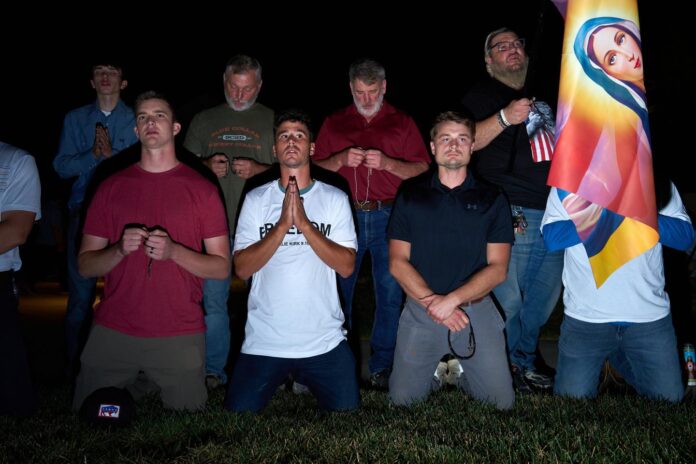 Des centaines de personnes ont afflué, après une journée de travail, dans un mélange de ferveur chrétienne et de convictions idéologiques. Pour eux, Charlie Kirk est le martyr d’une cause juste. Les casquettes MAGA, les drapeaux américains et les bibles se faisaient concurrence dans l’assistance.