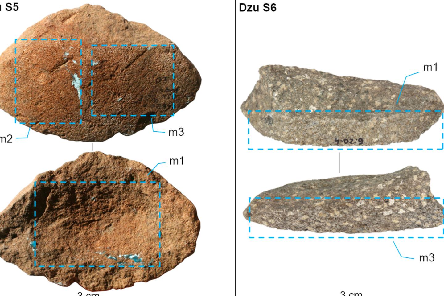 Galets trouvés dans les années 2000, dans la grotte de Dzudzuana, au pied des montagnes du Caucase, en Géorgie. Les lignes bleues en pointillé indiquent les positions des moules analysés, à partir desquels des microrésidus ont été extraits.