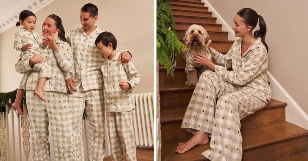 The collection includes matching styles for men, women, kids, babies, and pets, with prices starting from £13. The PJs come in a neutral cream check that has tiny fir trees, a red and white check, and a red check, although the red check doesn’t have a matching option for canine family members.