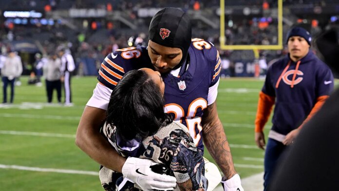 Gymnast Simone Biles greets her husband, Bears defensive back Jonathan Owens, before the Seattle Seahawks game at Soldier Field in Chicago on Dec. 26, 2024. (Daniel Bartel/Imagn Images)