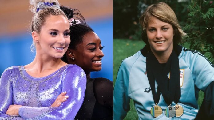 Former Olympic gymnast MyKayla Skinner with Simone Biles, left, and former Olympic swimmer Nancy Hogshead, right. (Ramsey Cardy/Sportsfile via Getty Images; Tony Duffy/Allsport/Getty Images)