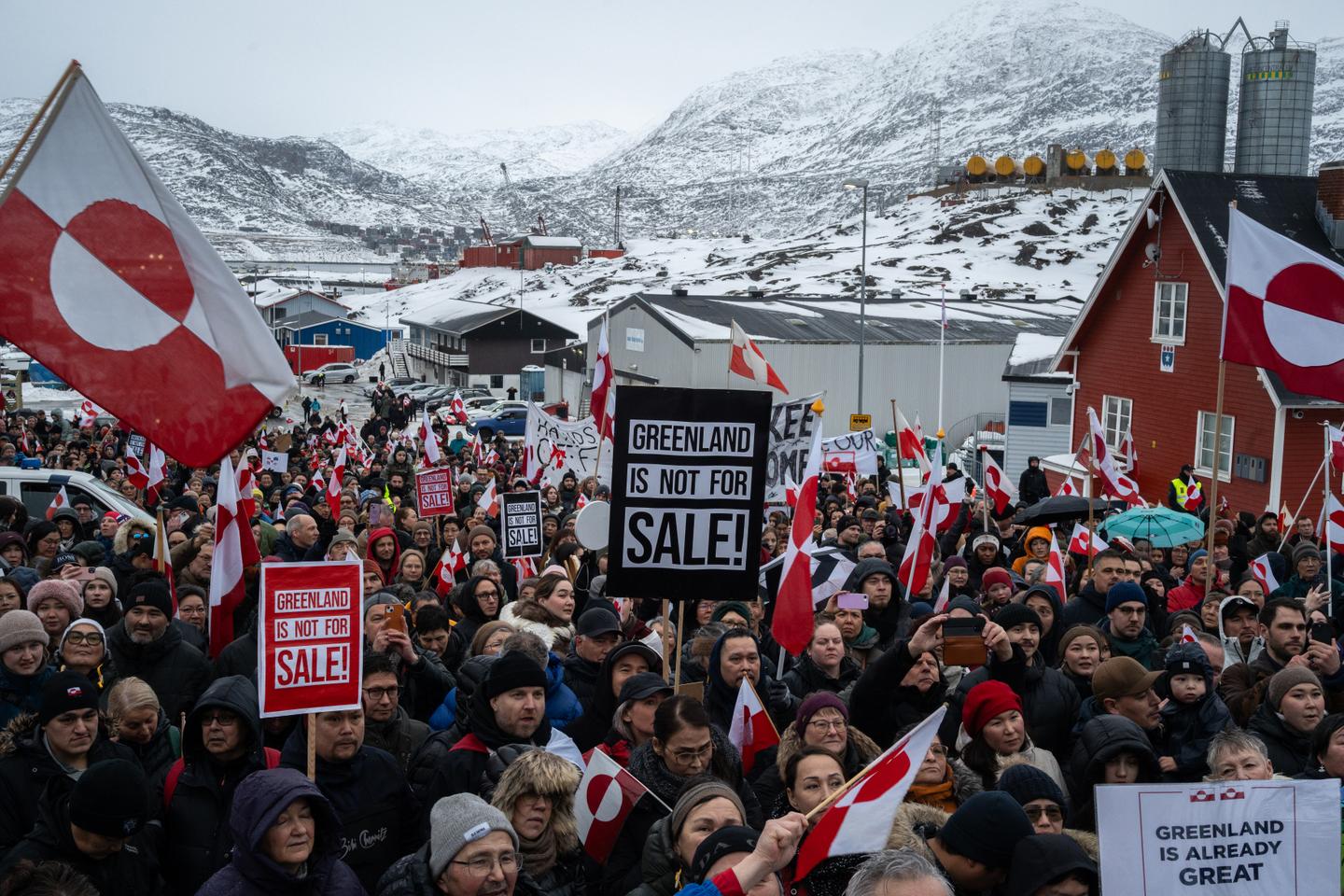 Pacifiques mais déterminés, les Groenlandais avec, en tête de cortège, leur premier ministre Jens-Frederik Nielsen, ont marché depuis le centre-ville de Nuuk sur les routes verglacées jusqu’au consulat américain. Employés d’hôtel, personnels hospitaliers, ouvriers ou salariés de la pêcherie, en famille, chacun portait l’emblème Erfalasorput, le drapeau national, un demi-cercle rouge sur fond blanc et un demi-cercle blanc sur fond rouge. La danse et le chant du quilaat (tambour), traditionnels dans la culture inuite lors d’événements – ou pour régler un conflit – ont donné le signal du départ.