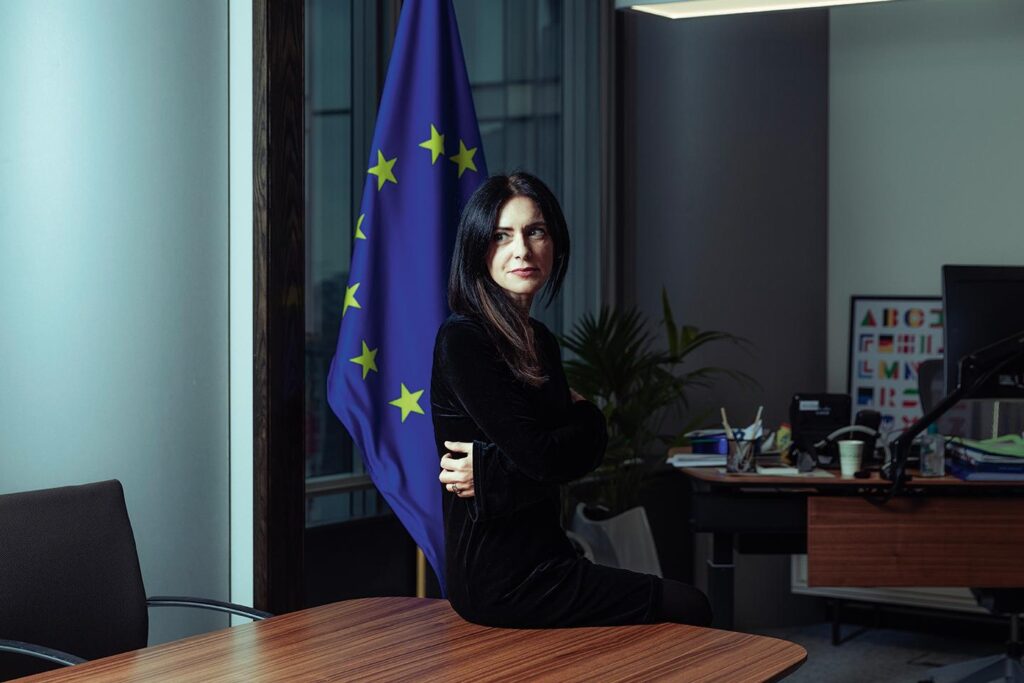 Pina Picierno est italienne, mais l’Ukraine est partout dans son bureau de vice-présidente du Parlement européen, à Bruxelles. Il y a les prix, posés sur le rebord de la fenêtre, qui récompensent son combat en faveur « de la liberté et de la démocratie en Ukraine », comme celui que lui a remis en 2022 l’Institut des affaires internationales, un think tank italien. Il y a des livres et des romans, consacrés à la Russie et à sa malheureuse voisine, envahie par les troupes du Kremlin en février 2022, et qui lutte depuis pour ne pas être dépecée et asservie. Il y a ce drôle de tableau, aussi, un cadeau de vétérans de l’armée ukrainienne représentant le trident jaune et bleu de leur pays, dans lequel ont été enfoncées de vraies balles…
