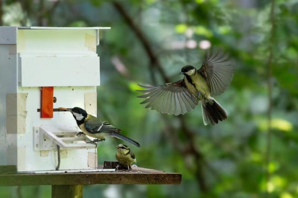 Une mésange charbonnière juvénile résout une énigme liée à la recherche de nourriture en poussant une porte coulissante vers la gauche, sous le regard de deux autres jeunes oiseaux.