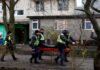 Firefighters work on the site of a burning building after a Russian attack in Kyiv, Ukraine, early Thursday, Aug. 28, 2025. (AP Photo/Efrem Lukatsky)