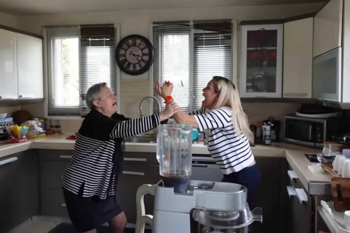 Capture d’écran extraite d’une vidéo postée sur la chaîne YouTube de la PNR Family en mai 2024, dans laquelle Valérie, la mère de famille, avec la complicité de ses enfants, fait croire à Mamou, la grand-mère, qu’elle s’est blessée avec un mixeur.