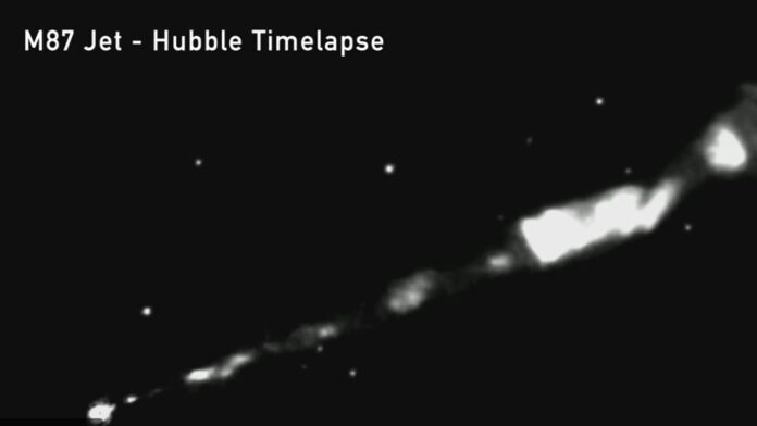 Scientists have traced a 3,000-light-year-long cosmic jet streaming out from the first black hole ever imaged to its source point with the help of “significantly enhanced coverage” from the global Event Horizon Telescope, a new study published this week revealed. (Hubble Telescope/NASA)