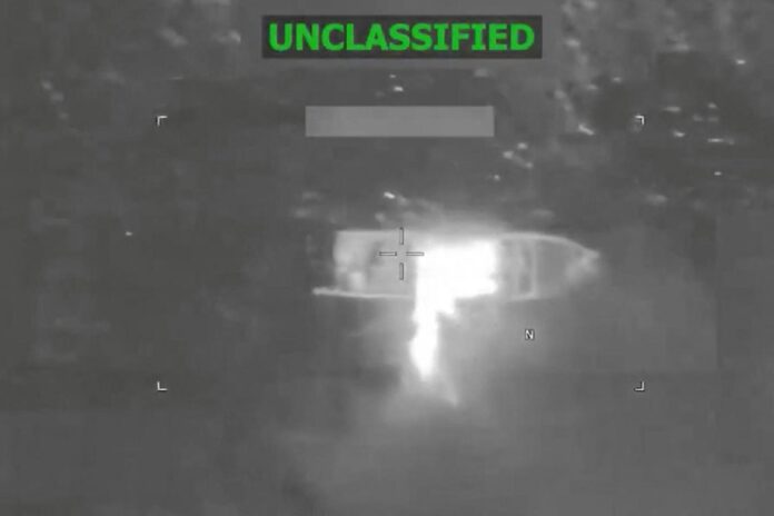Comme souvent depuis le lancement de cette campagne, l’armée a publié sur les réseaux sociaux une vidéo de la frappe, montrant une embarcation soufflée par une explosion filmée depuis les airs. L’administration du président américain, Donald Trump, n’a jamais fourni de preuve solide permettant d’affirmer que les navires visés étaient effectivement impliqués dans des trafics.