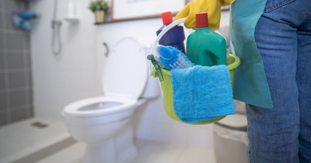A weekly scrub with a good disinfectant, paying particular attention to the flush handle and seat, helps reduce bacteria buildup and keeps things more hygienic in your bathroom.