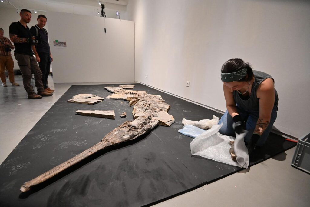Vendredi 10 octobre, avec Sébastien Enault, cofondateur de leur société Kraniata, elle a minutieusement assemblé les 27 pièces, faisant apparaître un animal aux ossements légèrement déformés par un long sommeil géologique. « Il est dans un état de conservation et de complétude exceptionnel, se réjouit Sébastien Enault. C’est l’une des pièces les plus extraordinaires qui nous sont passées entre les mains. »