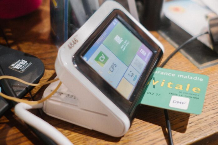 Une carte vitale insérée dans le lecteur d’une pharmacie rurale, à Saint-Pierre-des-Nids (Mayenne), le 7 octobre 2025.