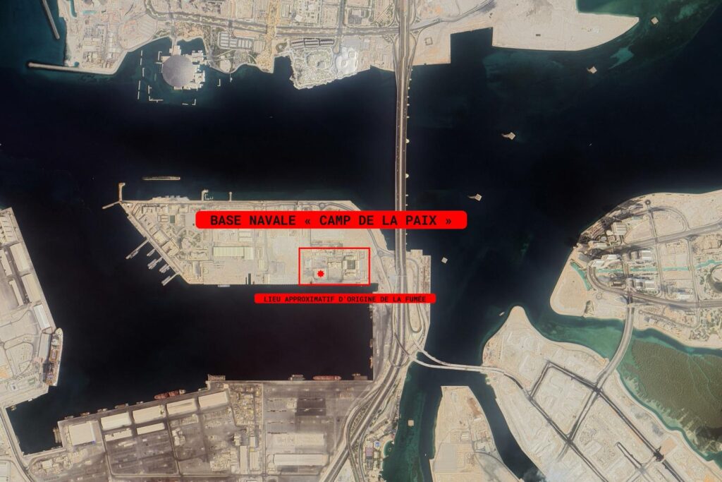 Quatre vidéos authentifiées et géolocalisées par Le Monde montrent une épaisse fumée noire se dégager d’une emprise militaire occupée par la France et située aux Emirats arabes unis. Cette base navale, appelée « Camp de la paix », est située dans le port Zayed, au nord-est d’Abou Dhabi.