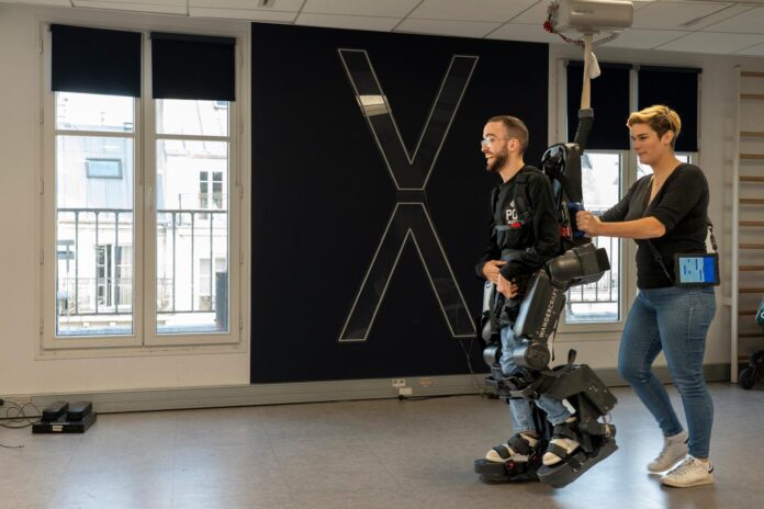La séance ne se déroule pas dans un cabinet médical ordinaire, mais dans la salle d’entraînement de la société française Wandercraft, installée dans un immeuble bourgeois du centre de Paris, à quelques pas de l’Hôtel de ville. Sur deux étages de 1 000 mètres carrés, l’entreprise et ses 140 salariés développent des exosquelettes médicaux et des robots industriels. Les ordinateurs où se conçoivent les algorithmes, en lien avec Mistral AI, le spécialiste français de l’intelligence artificielle (IA), voisinent avec l’atelier où sont testés les engins. En pleine ascension, la société prévoit de déménager à l’été 2026, dans le 13ᵉ arrondissement de Paris, dans un ancien bâtiment de La Poste quatre fois plus grand. Elle a également ouvert une antenne à New York depuis 2022, sur la prestigieuse Park Avenue, pour conquérir le marché américain.