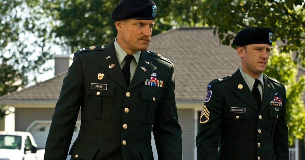Before he is discharged, he is dispatched as a casualty notification officer along with Captain Tony Stone (Woody Harrelson) as his mentor.