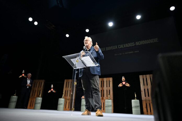 Le journaliste américain Jon Lee Anderson, président du jury, prononce un discours lors de la cérémonie de remise des prix de l’édition 2025 du prix Bayeux Calvados-Normandie des correspondants de guerre, à Bayeux, (Calvados), le 11 octobre 2025.